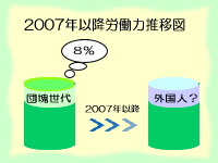 景気回復している中、少子高齢化が進んでおり、人口が減少し始めようとしている日本の社会では、今後、日本の経済を支えている労働力の減少が深刻な課題になっております。特に、労働力人口の約8%を占める団塊世代(1947−49年生まれ)の「2007年問題」、総人口の6.2%(総人口は1億2768万7千人、2004年)を占めている団塊ジュニア世代(1971−74年生まれ)などの大量退職者が始まると思われる「労働力減少の問題」を解決するには新たな人材を確保しなければなりません。一方、少子高齢化が進み、団塊世代の大量退職者が始まっている中、1998年〜2004年まで毎年平均70,149人の外国人が来日し、2004年末現在における外国人登録者数は197万3千747人、日本人総人口の約1.6%を占めております。