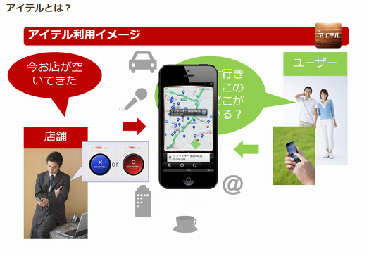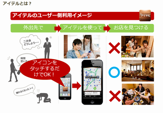 店舗を都道府県から選択しリスト表示する画面設計とは異なり、「すぐに入れる店舗を見つける」というコンセプトの通り、ワンタップで地図が開き、今いる場所と、アイテル店舗情報を視覚的に表示させるので、使いやすさの面でも従来のアプリより優位性があります。 |