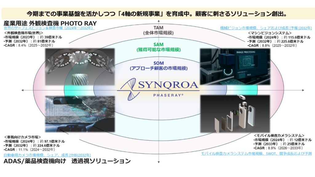 お客様のご要望に応じ、製品化したモジュール商材の販売~共同開発まで柔軟に対応可能しています。また、外観検査の領域だけでなく、今期までの事業基盤を活かしつつ「4軸の新規事業」を育成中。顧客に刺さるソリューション創出中です。