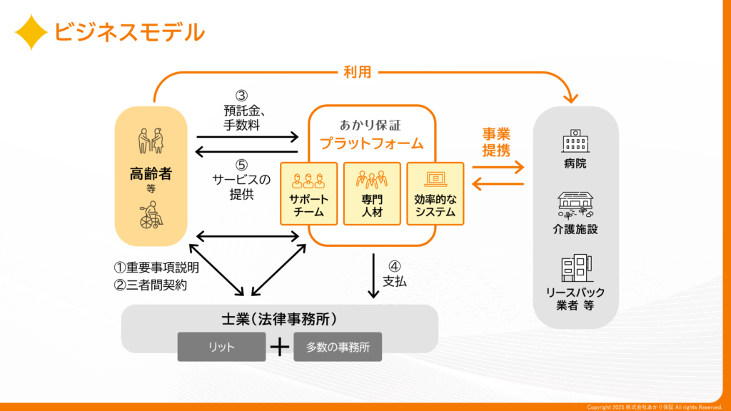本事業は、身元保証事業を基盤として生涯支援・資産管理へと事業領域を拡大する。まず大阪府で事業連携モデルを構築し、事業化を進めて顧客基盤を確立する。2027 年には、預託金の信託商品化を通じて都市圏での展開を強化し、事業の安定化を図ります。その後、2030 年以降、保険商品の共同開発などにより生涯支援サービスを進化させ、全国展開へと拡大します。最終的には、ARR4,000 百万円超・顧客数3 万人規模の持続的成長を目指します。