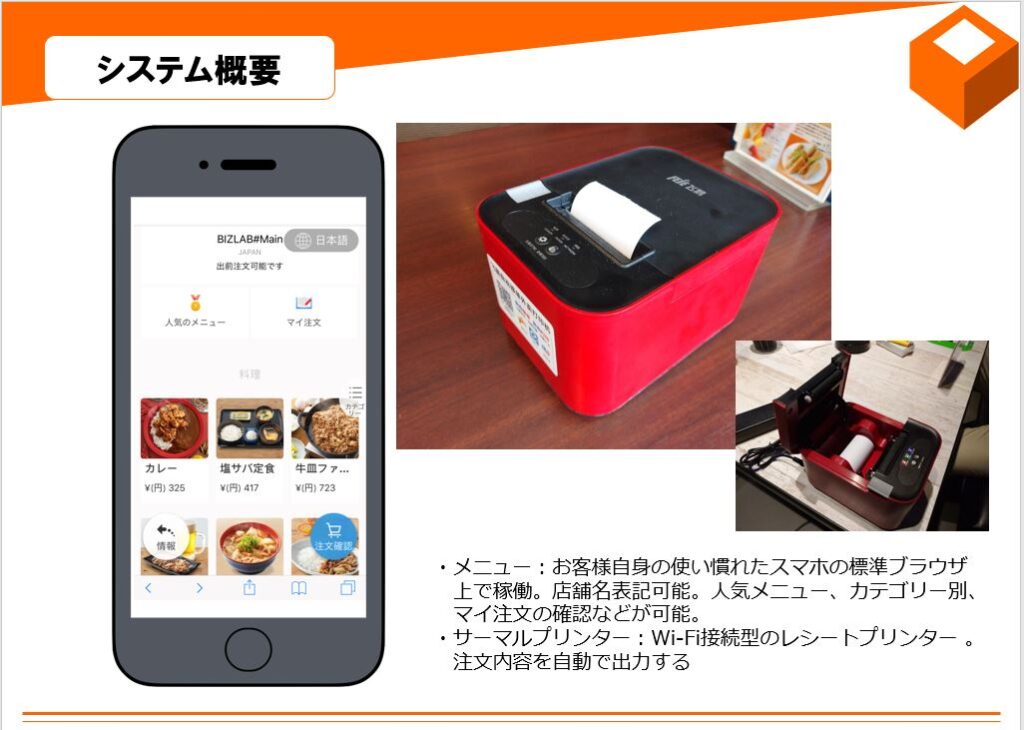 そして“決済”が行われる前段階として“注文”がないといけないことに着目し、飲食店に来店したお客様が自身のスマホを用いてQRコードを読み取り、お客様のスマホでオーダーが確定すると同時に店側にオーダーが伝送される、飲食店の注文業務の省力化・効率化及びお客様への利便性が図れる注文管理システムを開発いたしました。
