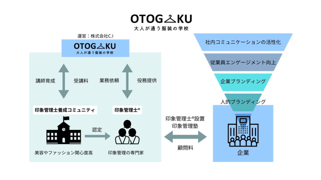 - 印象管理士®顧問設置 企業の中の印象管理部のような存在を構築します。ロゴやコーポレートカラーなどは専門家に外注しているケースが一般的です。従業員のブランディングも外注することで新しい企業文化ができると考えております。