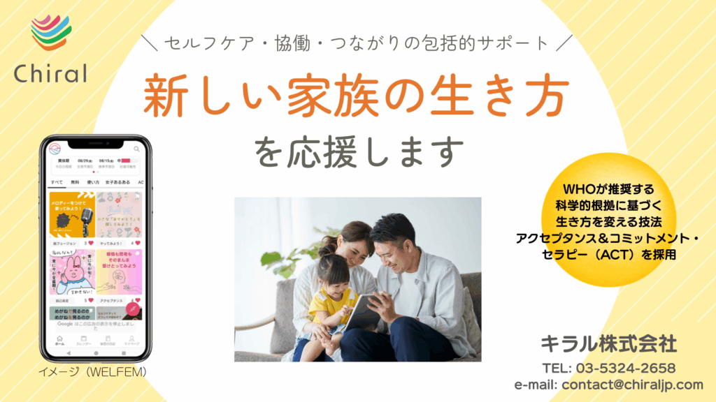 スマホアプリはACT ( アクセプタンス&コミットメント・セラピー) を用いたセルフケア機能、夫婦・家族のコミュニケーションをサポートする協働機能、境遇の近い人等とのコミュニケーションをとるつながり機能(産後ケア事業との接続を含む)からなる包括的なサポートサービスです。