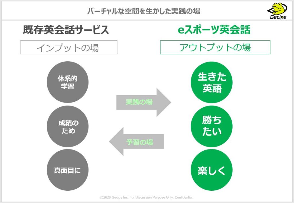英会話を学んでいる学習者の最大の課題は、既存のインプット中心の英会話学習だけでは話せるようにならないという点です。「eスポーツ英会話」は、アウトプット中心の実践の舞台を提供するため、話せるようになりたい学習者には必要不可欠な実践の場となります。