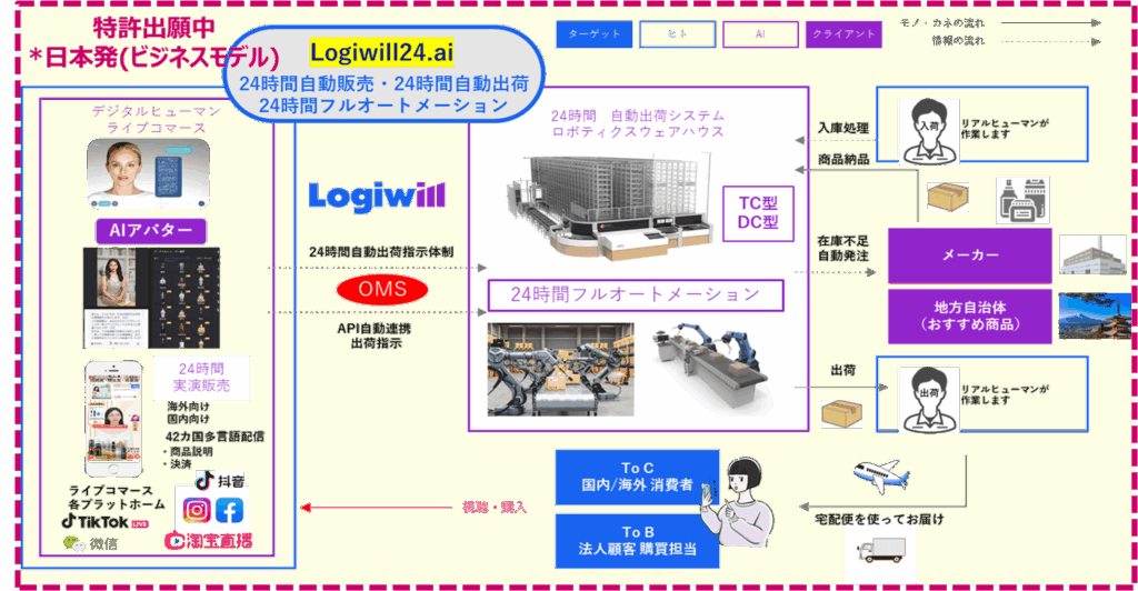 弊社ビジネス構想「Logiwill24.ai 」の取組として、生成AI で制作されたデジタルヒューマンによるライブコマースを活用し、中国本土 および日本国内で自動化された24 時間宣伝販促活動とデータ連携の自動ピッキングを実現、日本ブランドの越境販売強化に貢献いたします。
