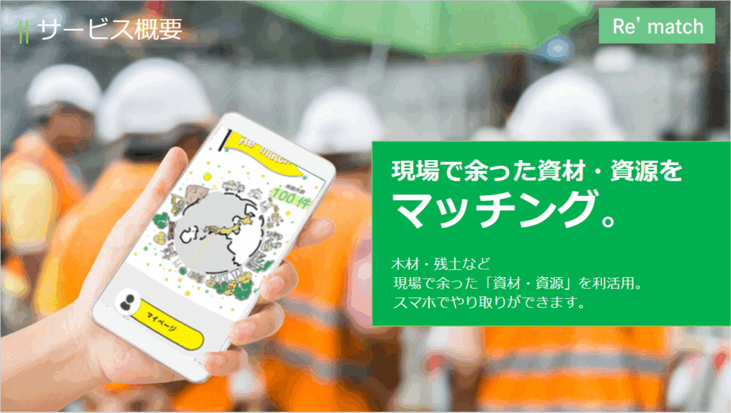 建設現場では、あまりにも多くの資材・資源がまだ有効活用できるにも拘らず、費用を支払って郊外で処分をしている実態があります。それらを目の当たりにし、“もったいない”と強く感じ、「Re'match」を開発しました。